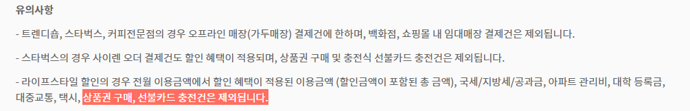 대부분의 카드의 경우 아래와 같이 유의사항에 '상품권 구매, 선불카드 충전건은 제외됩니다' 라고 명시하고 있습니다.