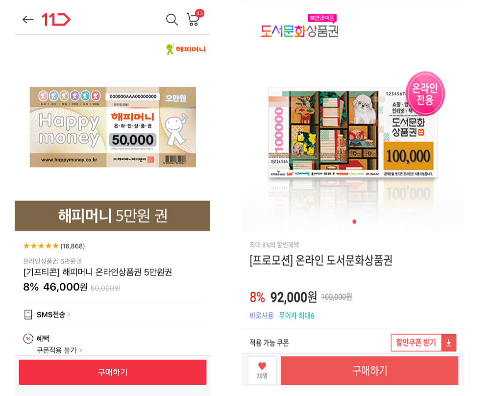 해피머니 상품권, 북앤라이프 상품권은 지류 상품권이 아니라 사진과 같이 온라인 상품권을 구매합니다(기프티콘 혹은 PIN번호 발송 형태)